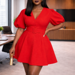 Command the room in the Valentina. This structured mini features a deep V-neckline, dramatic puff sleeves, and a matching waist-cinching belt. Crafted from premium mid-weight fabric, it’s the ultimate “power dress” for your next high-stakes meeting or cocktail hour.