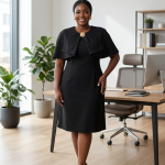 Command attention with regal poise in the Arizona Cape Dress, a sophisticated fusion of classic tailoring and dramatic flair. This isn’t just a Little Black Dress; it’s an executive statement piece that balances the strength of a structured shift with the soft, flowing movement of a cape.
