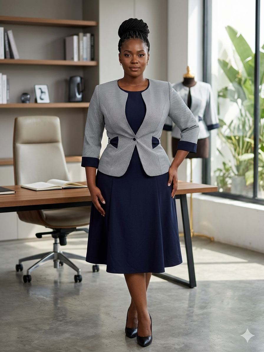 Command the room with the Lady Morgana Set, a definitive power pairing designed for the modern executive. This ensemble eliminates the guesswork of professional dressing, combining a fluid A-line dress with a sharply structured jacket for a look that is as commanding as it is elegant.